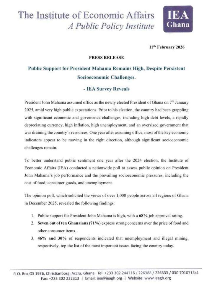 This is according to a nationwide opinion poll conducted by the Institute of Economic Affairs (IEA), with findings released in a press statement dated February 11, 2026.