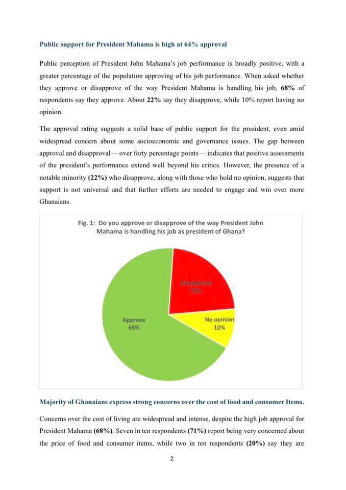 The survey shows that 68 percent of respondents approve of the way President Mahama is handling his job, while 22 percent disapprove and 10 percent say they have no opinion.
