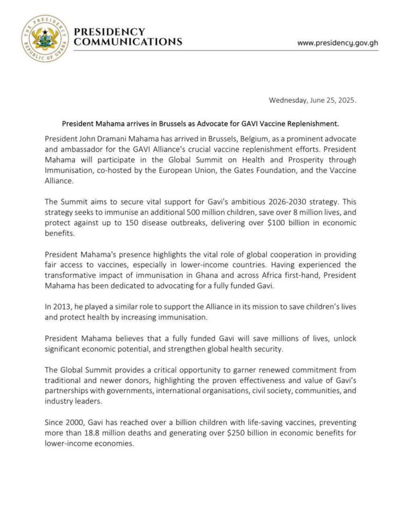 The President of the Republic of Ghana, John Dramani Mahama, has arrived in Brussels, Belgium, as a key advocate for the GAVI Alliance’s global vaccine replenishment drive. The announcement was officially made today, June 25, in a statement signed by Felix Kwakye Ofosu, Spokesperson to the President and Minister for Government Communications.