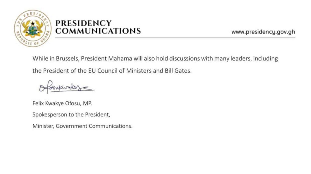 While in Brussels, President Mahama is also expected to hold high-level discussions with several global leaders, including the President of the EU Council of Ministers and Bill Gates, as part of efforts to strengthen international collaboration on health and vaccine equity.