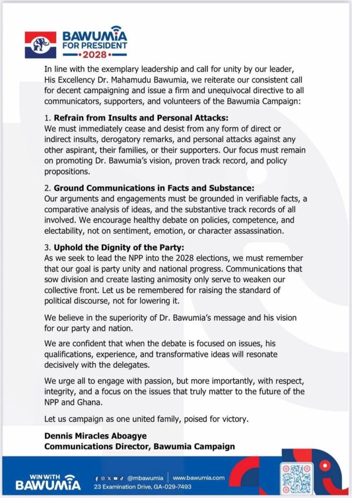 In response, the campaign reiterated its commitment to an issue-based, respectful, and fact-driven process. It urged all supporters, communicators, and volunteers of the Bawumia Campaign to refrain from engaging in insults or personal attacks, whether direct or indirect, against other aspirants, their families, or their supporters. Instead, they are encouraged to focus on promoting Dr. Bawumia’s vision, proven track record, and policy ideas.