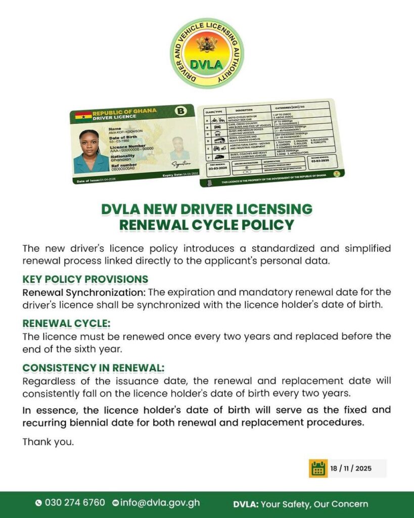 The Driver and Vehicle Licensing Authority (DVLA) has announced major reforms to Ghana’s driver’s licence renewal system, introducing a streamlined process that aligns all renewal and expiry dates with the licence holder’s date of birth.