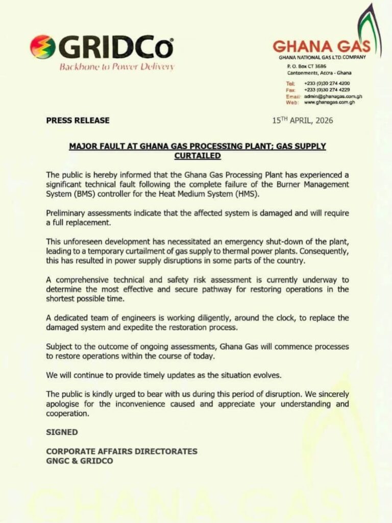A major technical fault at the Ghana Gas Processing Plant has forced an emergency shutdown, disrupting gas supply to thermal power plants and triggering power outages in parts of the country.