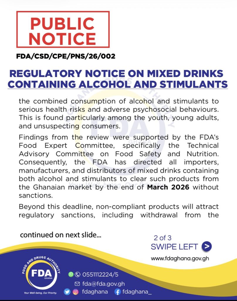 Consequently, the Authority has directed all importers, manufacturers and distributors of mixed drinks containing both alcohol and stimulants to clear such products from the Ghanaian market by the end of March 2026, without sanctions. However, it warned that beyond this deadline, “non-compliant products will attract regulatory sanctions, including withdrawal from the market.” The directive takes effect immediately.