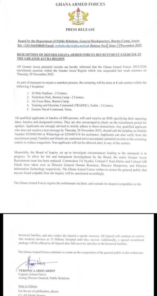 According to the statement, “all Greater Accra potential recruits are hereby informed that the Ghana Armed Forces 2025/2026 recruitment exercise resumes on Thursday, 20 November 2025.”
