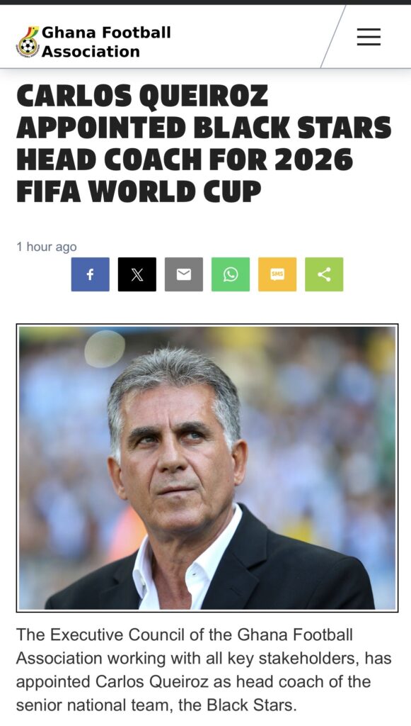The Ghana Football Association (GFA) has appointed Portuguese coach Carlos Queiroz as the new head coach of the Black Stars ahead of the 2026 FIFA World Cup.