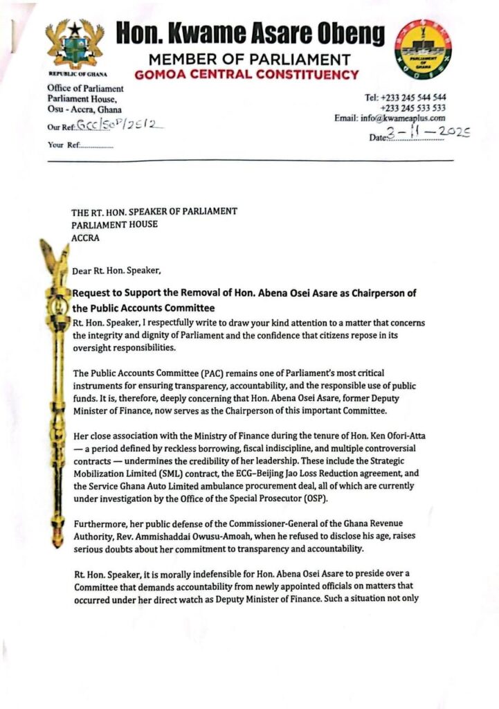 The Member of Parliament for Gomoa Central, Hon. Kwame Asare Obeng, has formally written to the Speaker of Parliament, Rt. Hon. Alban Sumana Kingsford Bagbin, requesting his intervention and support for the removal of Hon. Abena Osei Asare as Chairperson of the Public Accounts Committee (PAC).