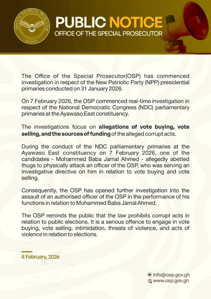 The Office of the Special Prosecutor (OSP) has launched investigations into alleged electoral corruption during the New Patriotic Party (NPP) presidential primaries held on 31 January 2026 and the National Democratic Congress (NDC) parliamentary primaries at Ayawaso East on 7 February 2026.