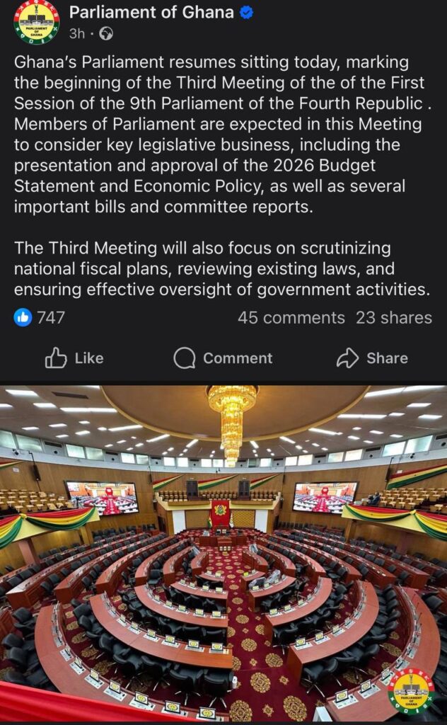 According to a post on the official Facebook page of the Parliament of Ghana, this final meeting is expected to be busy as Members of Parliament focus on important national issues, including presenting and approving the 2026 Budget Statement and Economic Policy.