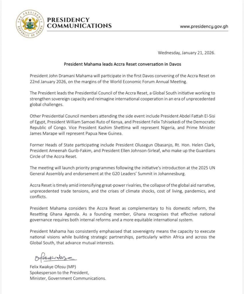 President John Dramani Mahama is set to take the Accra Reset initiative to the global stage, leading its first Davos convening on January 22, 2026, on the margins of the World Economic Forum (WEF) Annual Meeting in Switzerland. The high-level side event marks a major step in advancing the Global South–led agenda to reshape international cooperation and strengthen sovereign capacity.