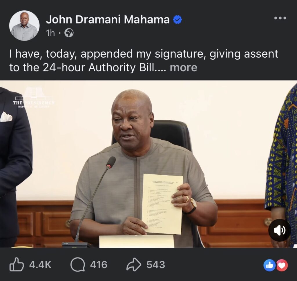 Speaking at the brief signing ceremony, President Mahama described the moment as both historic and necessary. He revealed that he had “just appended my signature to give assent to the 24-hour authority bill,” noting that it is a piece of legislation “Ghanaians have been working for” over time.