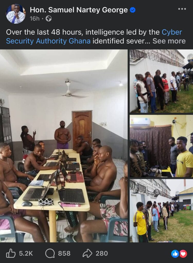 Sharing details of the operation on his official Facebook page, the Minister for Communications and Digital Technology, Hon. Samuel Nartey George, cautioned foreign nationals against falling victim to deception by criminal networks.