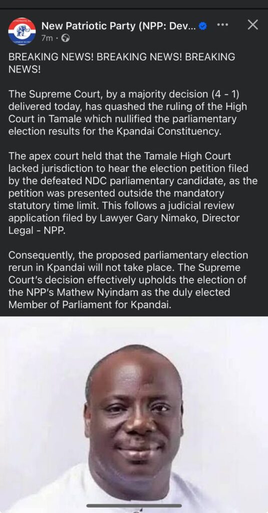 In a majority decision of 4–1 delivered on Tuesday, the apex court held that the Tamale High Court lacked jurisdiction to hear the election petition brought by the defeated National Democratic Congress (NDC) parliamentary candidate. According to the Supreme Court, the petition was filed outside the mandatory statutory time limit prescribed by law, rendering the High Court’s proceedings invalid.