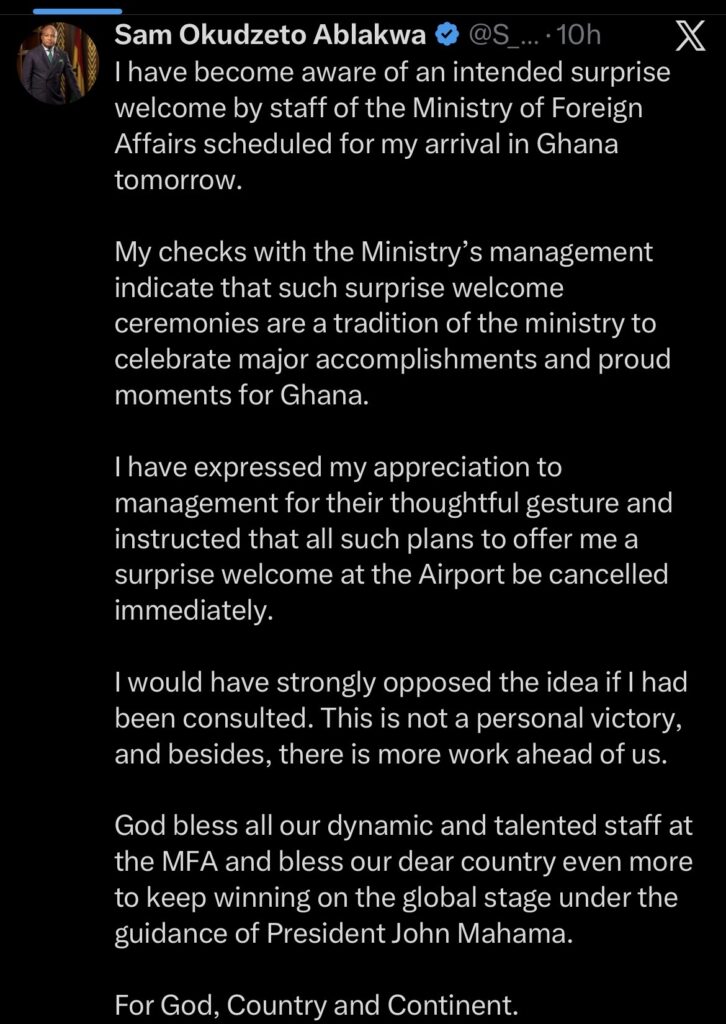 “I have become aware of an intended surprise welcome by the staff of the Ministry of Foreign Affairs scheduled for my arrival in Ghana tomorrow,” he wrote.